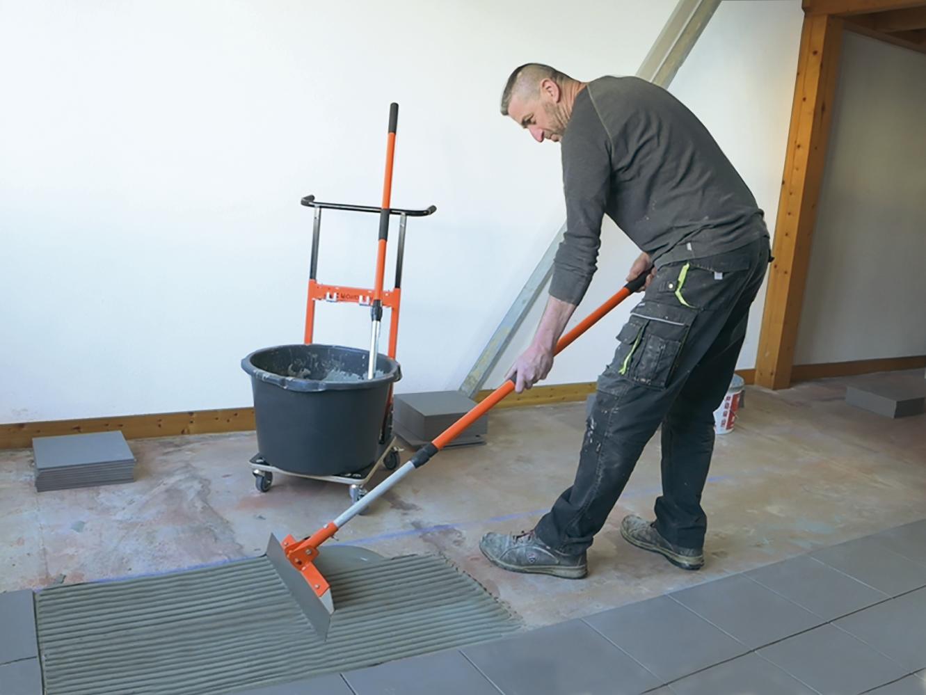 Une nouvelle génération de carreleurs est en marche. CARELO est un système innovant conçu pour les carreleurs professionnels. Il se compose d'un chariot robuste et pliable avec un seau de grande capacité pour le transport de la colle, et d'outils sur perche permettant une application de la colle en position debout. Plus besoin de travailler à genoux! Cette solution réduit ainsi les douleurs et les troubles musculosquelettiques (TMS). Kit complet pour transporter et appliquer la colle tout en restant debout. Composition du kit : 1 chariot de transport + 1 bac de 40 litres + 1 pelle sur perche pour déposer la colle sur le sol en restant debout + 1 peigne à colle denté demi-rond sur perche qui permet de tirer la colle en restant debout. Une seconde lame en denture 10x10 mm est incluse dans le kit. Perche télescopique de 85 cm à 160 cm.